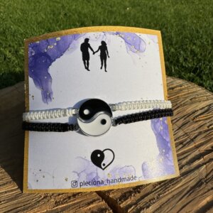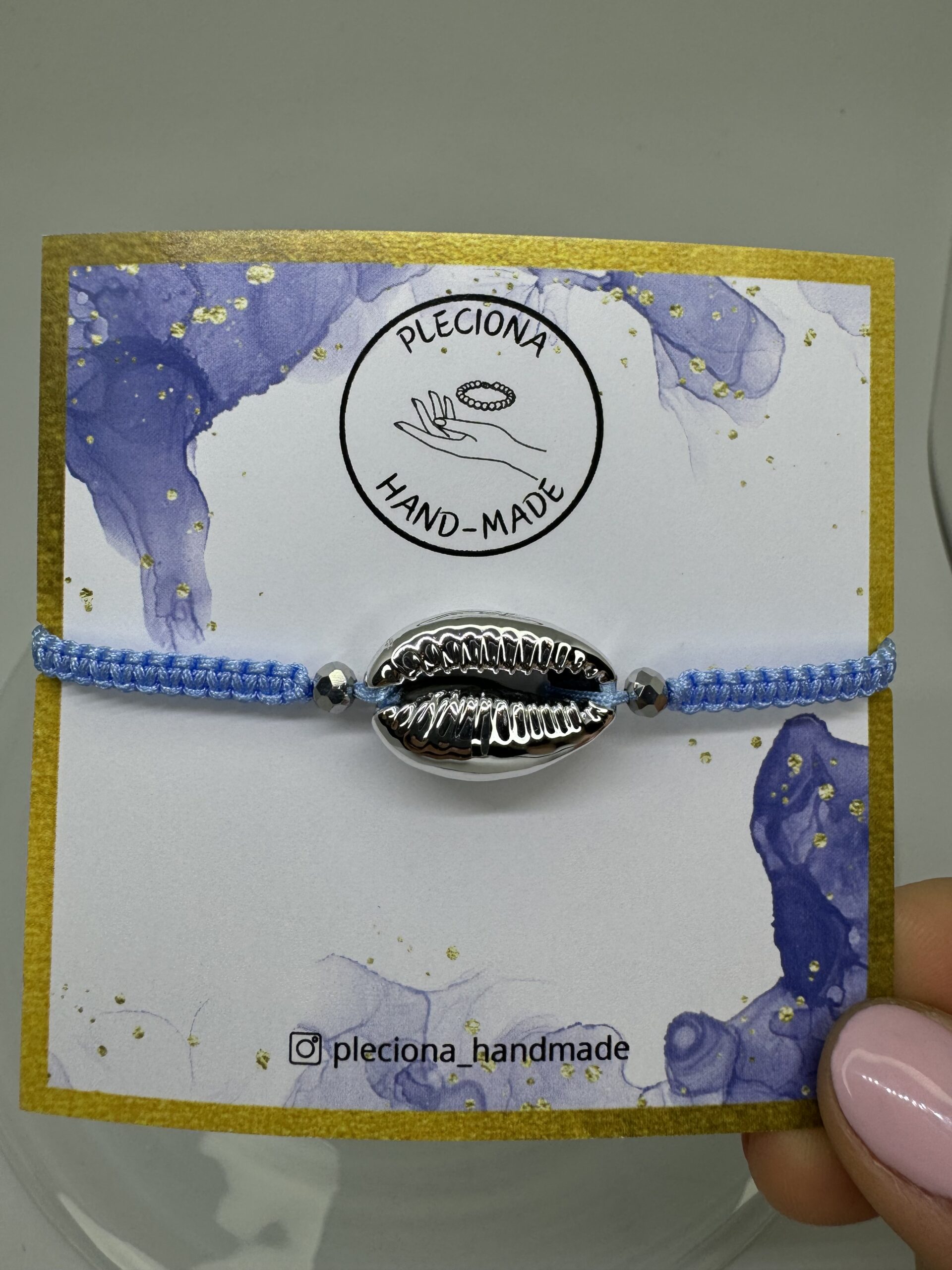 Ręcznie pleciona, regulowana bransoletka ze srebrną muszelką i kryształkami.