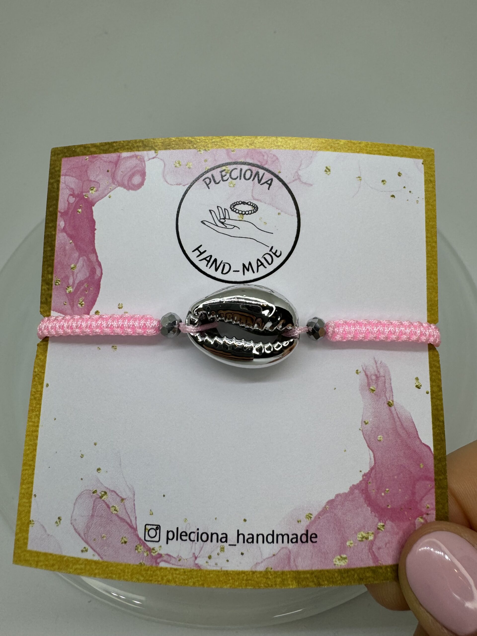 Ręcznie pleciona, regulowana bransoletka ze srebrną muszelką i kryształkami.