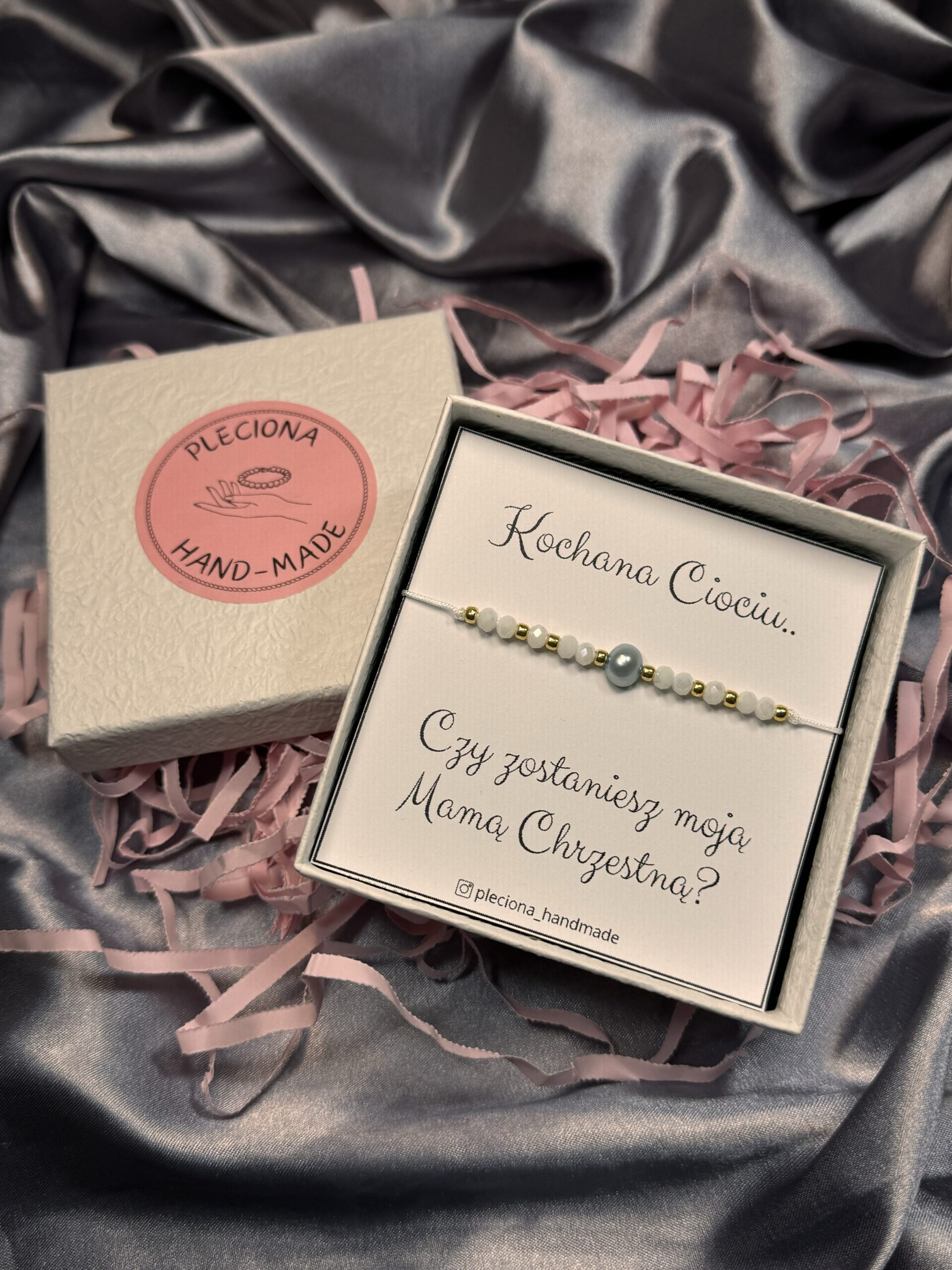 Bransoletka dla Chrzestnej to wyjątkowy, ręcznie wykonany prezent, który łączy w sobie elegancję i możliwość personalizacji. Wykonana ze szklanych kryształków, japońskich koralików oraz naturalnej perły barwionej na niebiesko, zachwyca subtelnym blaskiem i unikatowym charakterem.