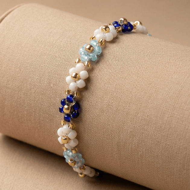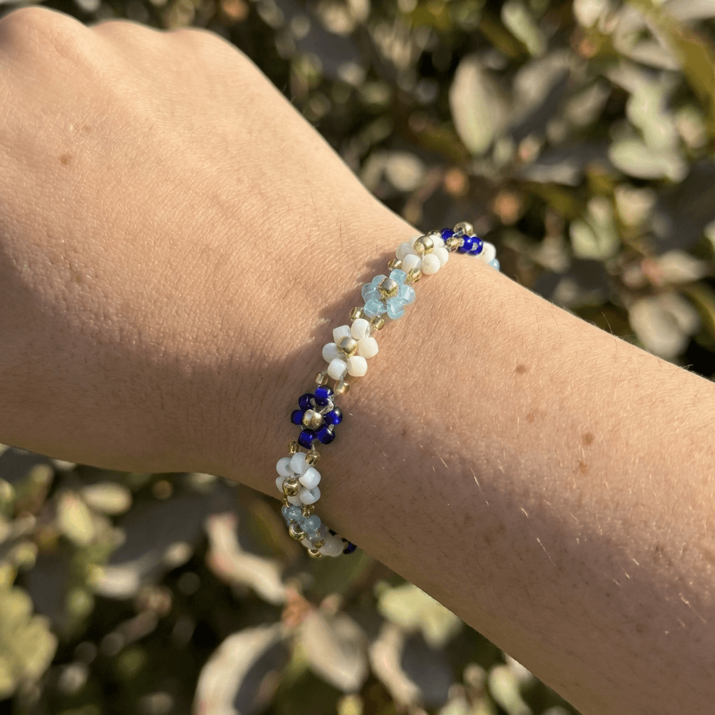 Bransoletka Daisy została wykonana z wysokiej jakości japońskich koralików w kolorze granatowym, błękitnym i białym, tworząc delikatny, kwiatowy wzór inspirowany naturą. Lekka i wygodna w noszeniu, świetnie sprawdzi się zarówno na co dzień, jak i jako uzupełnienie eleganckich stylizacji.