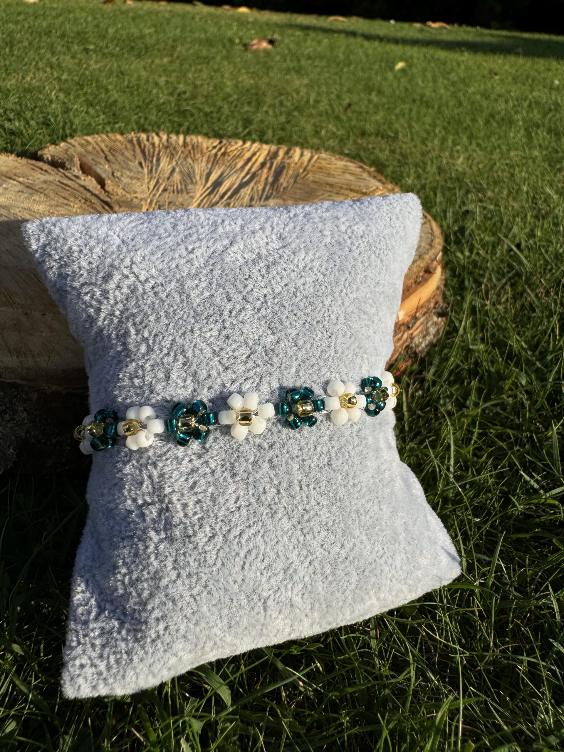 Bransoletka Daisy Kwiatuszki szmaragdowo-biała – ręcznie robiona biżuteria handmade