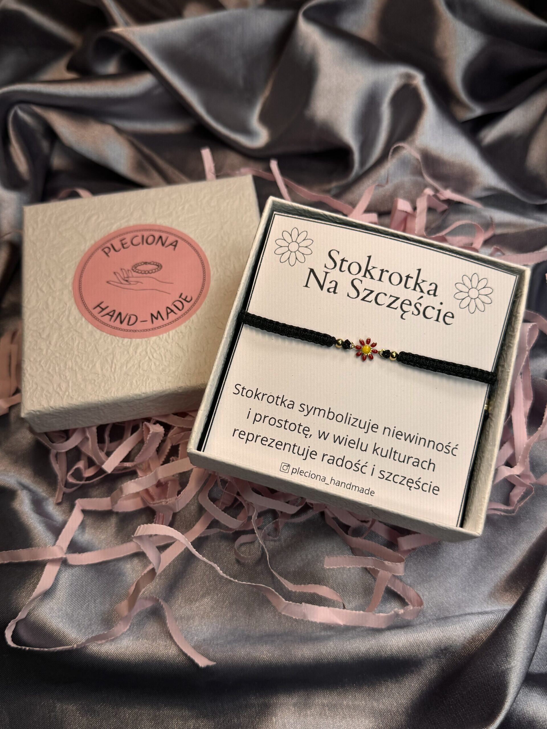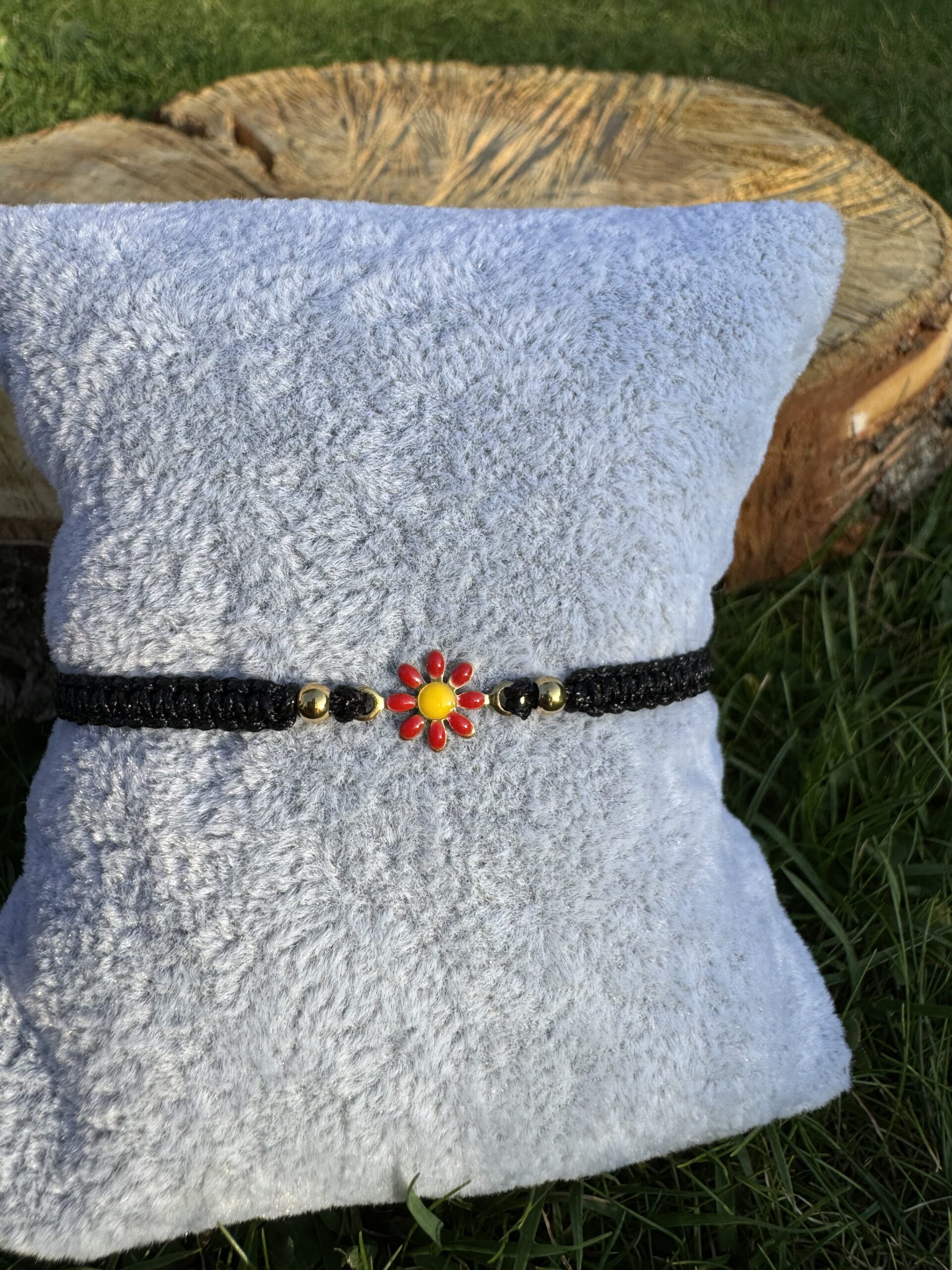 Regulowana bransoletka z czerwoną stokrotką ze stali szlachetnej to wyjątkowy, ręcznie robiony dodatek, który doda energii i koloru każdej stylizacji. Czerwona stokrotka symbolizuje odwagę, radość i pozytywne nastawienie do życia, a jej intensywny kolor przyciąga wzrok i podkreśla indywidualny styl. Bransoletkę wykonano z trwałej stali szlachetnej oraz wytrzymałego sznurka jubilerskiego, dzięki czemu jest odporna na codzienne użytkowanie oraz jest bezpieczna dla skóry.