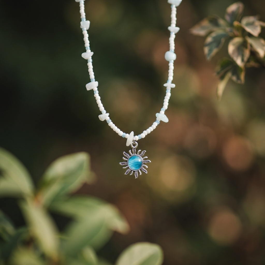 Słoneczny naszyjnik z akwamarynem w srebrnym wykończeniu to wyjątkowy, ręcznie robiony dodatek dla miłośniczek naturalnych kamieni i subtelnej elegancji. Centralnym punktem naszyjnika jest naturalny akwamaryn, który zachwyca delikatnym, błękitnym odcieniem i pięknie odbija światło, dodając blasku każdej stylizacji. Akwamaryn znany jest jako kamień odwagi, harmonii i pozytywnej energii – wspiera spokój, komunikację i sprzyja dobrym relacjom.