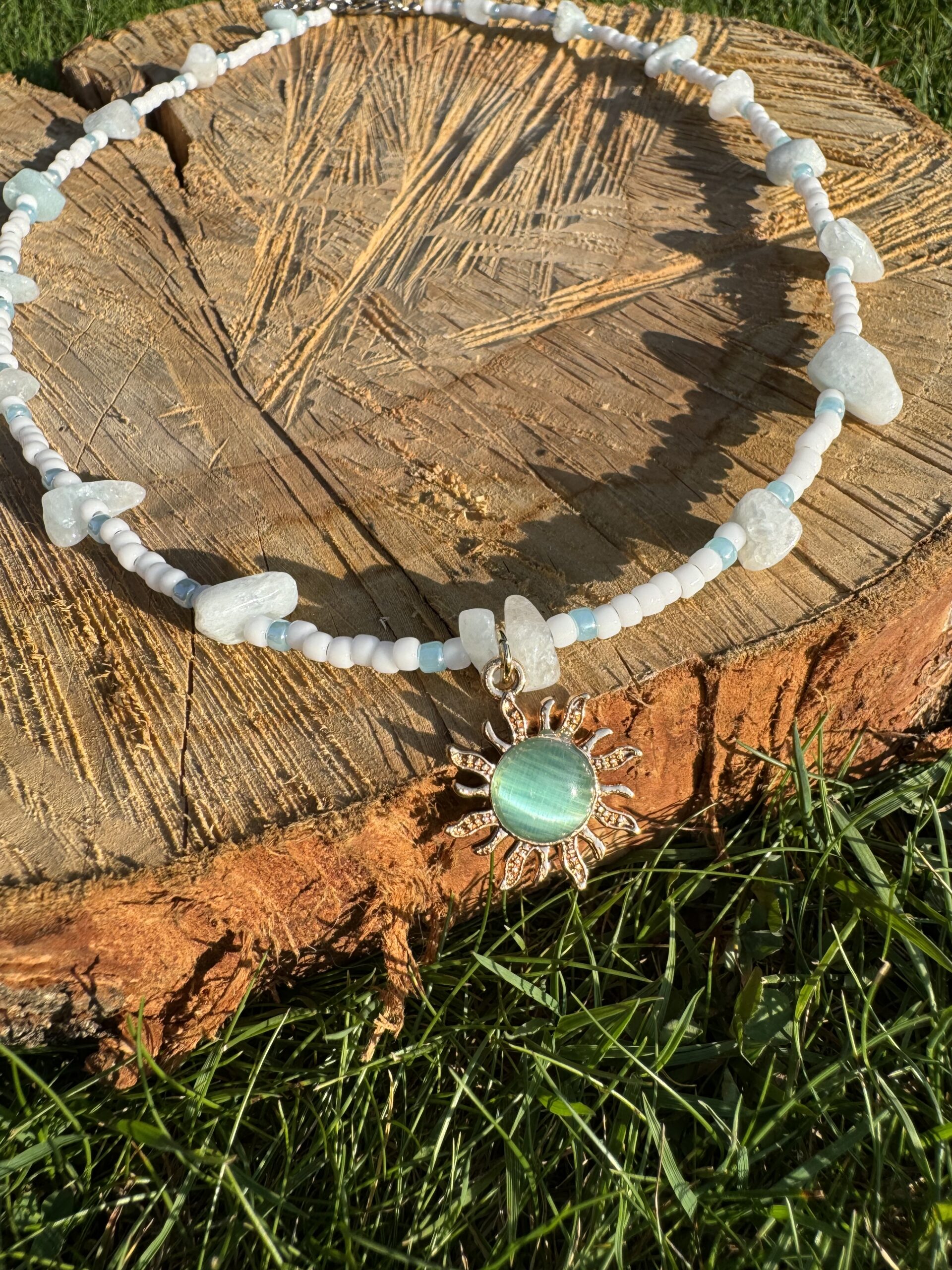 Słoneczny naszyjnik z akwamarynem w złotym wykończeniu to ręcznie robiona, elegancka biżuteria inspirowana naturalnym pięknem i słońcem. Centralnym punktem naszyjnika jest naturalny akwamaryn – kamień symbolizujący odwagę, spokój i pozytywną energię. Akwamaryn wspiera komunikację, łagodzi napięcia i dodaje pewności siebie, dlatego naszyjnik ten jest idealny dla osób ceniących zarówno wyjątkowy wygląd, jak i pozytywne właściwości kamieni.