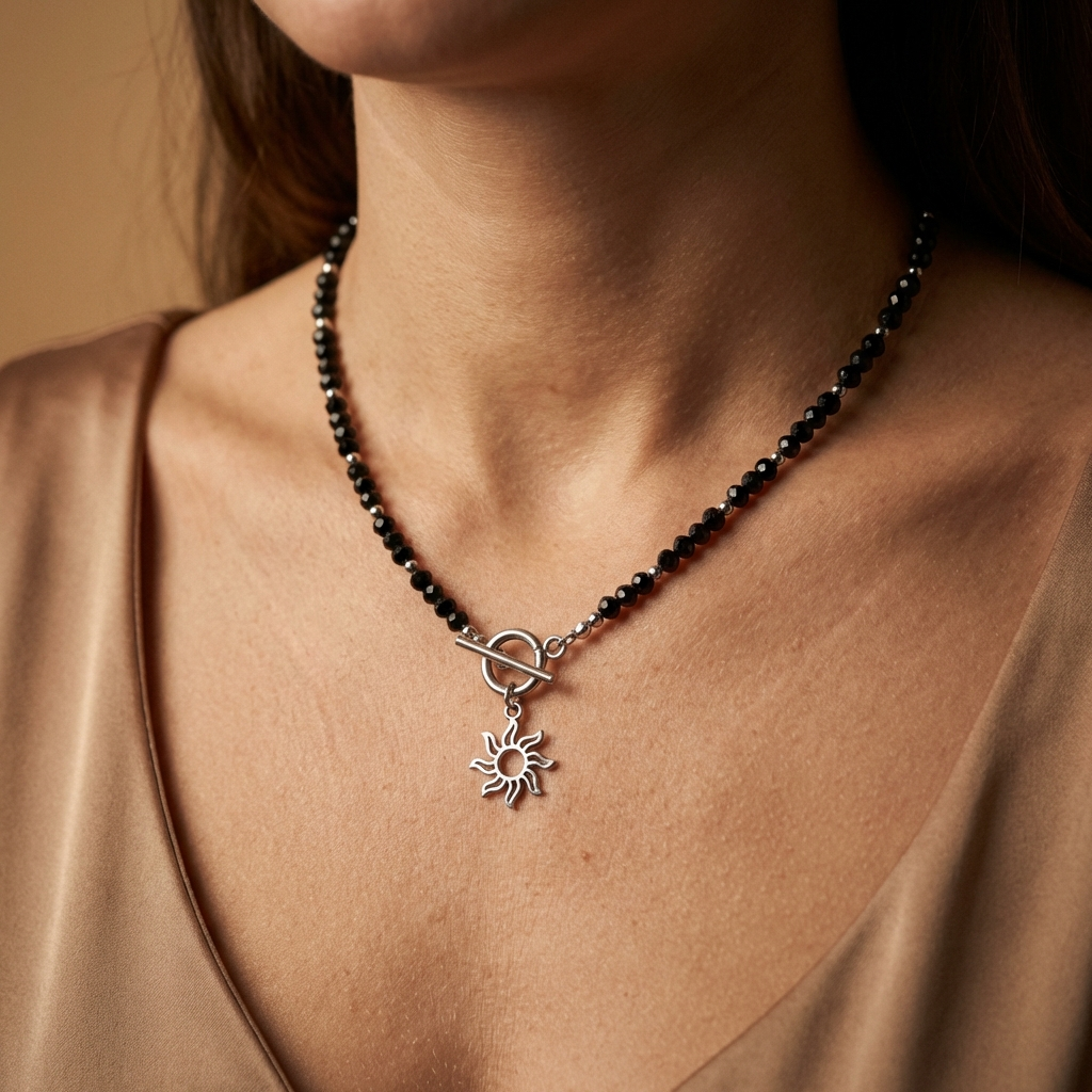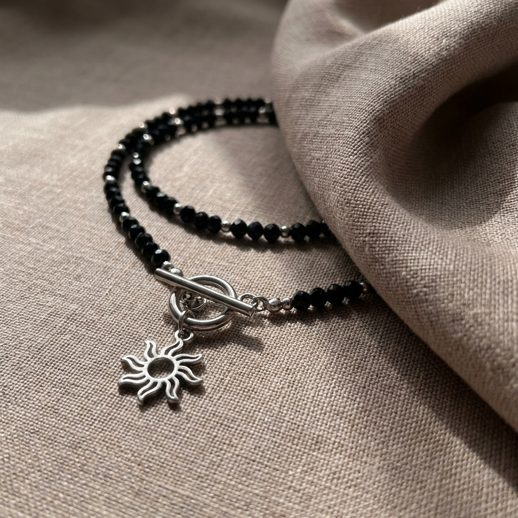 Naszyjnik Black Silver ze stali chirurgicznej to ręcznie wykonany, minimalistyczny dodatek, który doskonale podkreśli każdą stylizację. Stworzony z wysokiej jakości szklanych kryształków w odcieniu głębokiej czerni oraz srebrnych elementów ze stali chirurgicznej, zachwyca elegancją i uniwersalnością. Stal chirurgiczna 316L gwarantuje trwałość, odporność na zarysowania oraz bezpieczeństwo nawet dla wrażliwej skóry.
