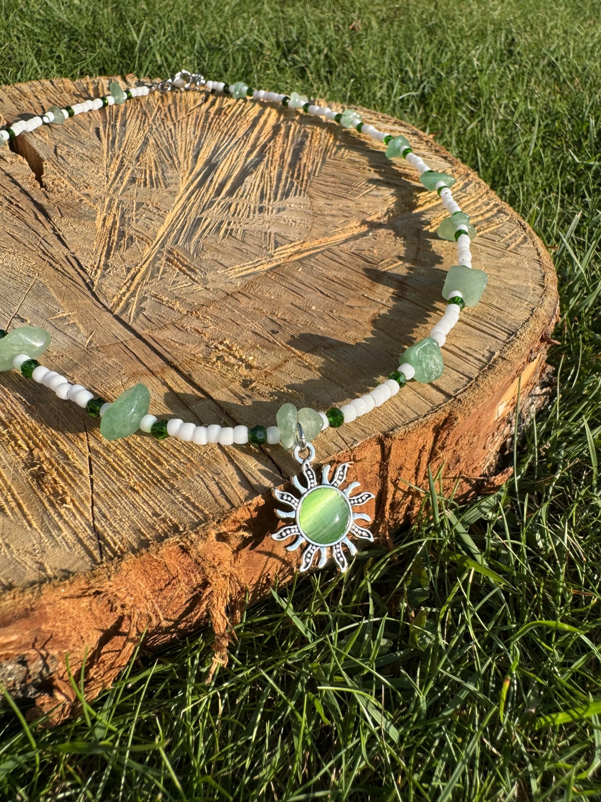 Słoneczny naszyjnik z zielonym jadeitem w srebrnym wykończeniu to wyjątkowy, ręcznie robiony dodatek dla miłośniczek naturalnych kamieni i subtelnej elegancji. Centralnym punktem naszyjnika jest naturalny jadeit w intensywnie zielonym odcieniu, który symbolizuje harmonię, szczęście i pozytywną energię. Kamień ten od wieków uważany jest za talizman dobrobytu i równowagi.
