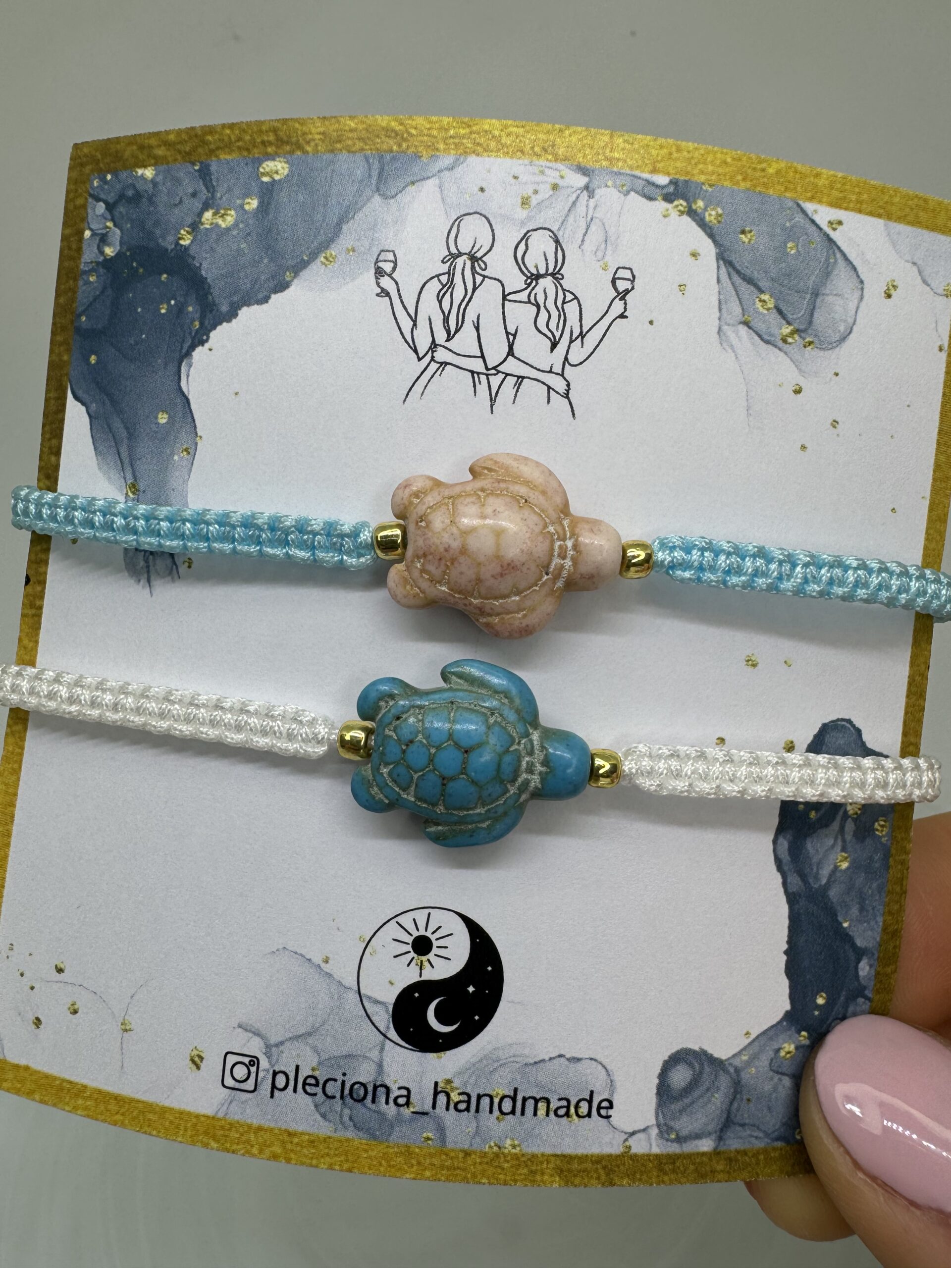 Zestaw „Żółwik na szczęście” dla przyjaciółek to wyjątkowy symbol przyjaźni, szczęścia i wsparcia. Każdą bransoletkę wykonano ręcznie z wytrzymałego sznurka jubilerskiego i ozdobiona uroczym żółwikiem z naturalnego howlitu – kamienia znanego z właściwości wyciszających, wspierających harmonię i pozytywną energię. Howlit jest ceniony jako talizman spokoju, cierpliwości i dobrych relacji, dlatego taki prezent to doskonały wybór dla bliskiej osoby.